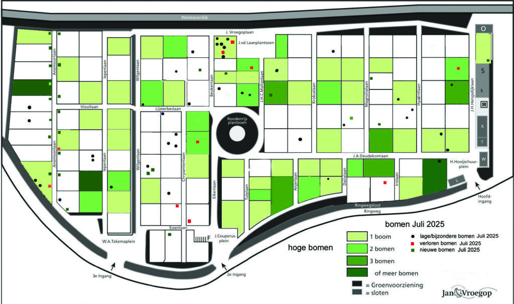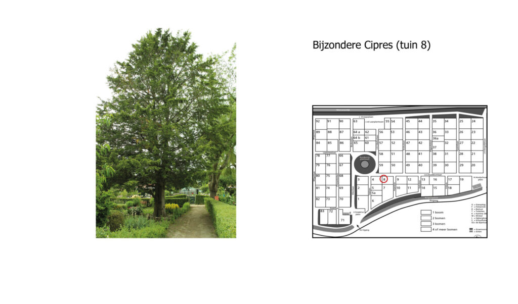 Onderstreept zijn de bomen in de tuinen langs de hoofdpaden die onder beheer van de vereniging vallen.